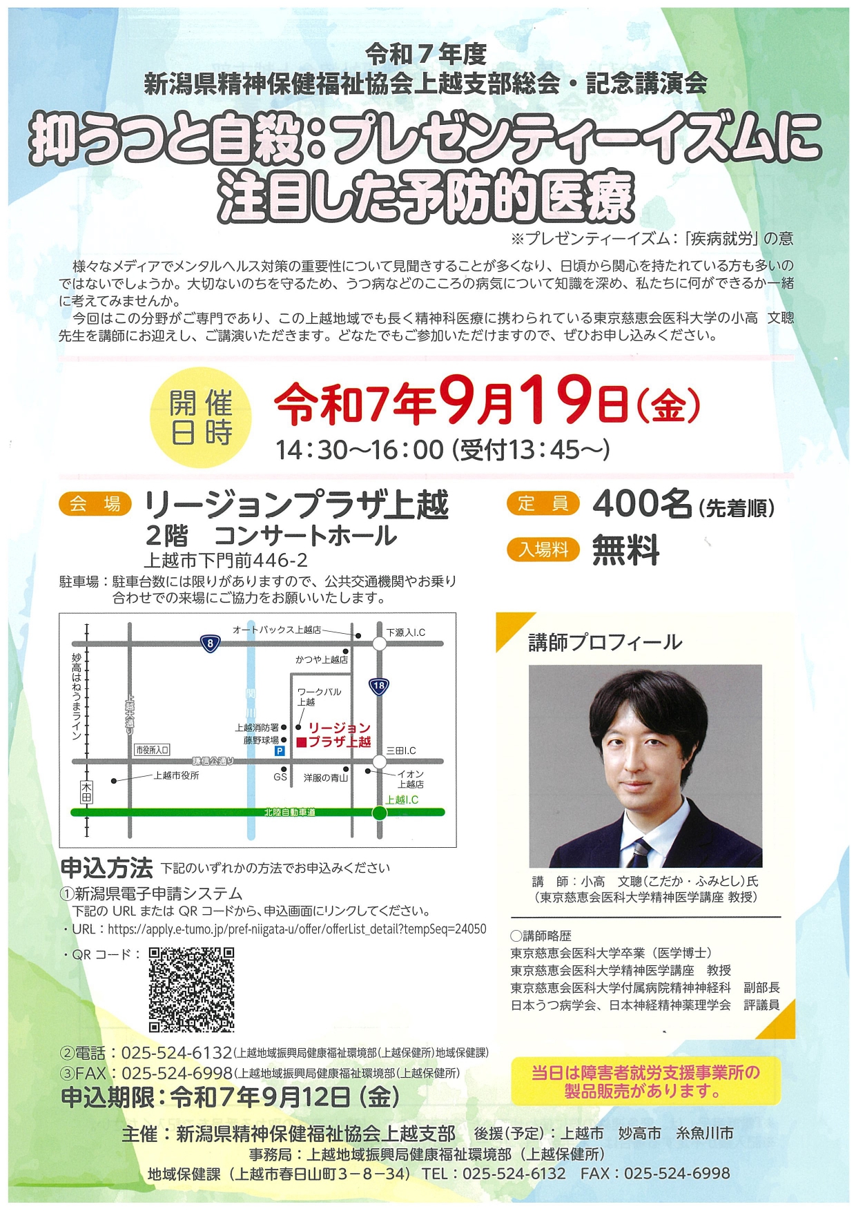 令和7年9月19日(金)14:30より、リージョンプラザ上越において東京慈恵会医科大学精神医学講座教授である小髙 文聰(こだか ふみとし)先生を講師にお招きし、「抑うつと自殺:プレゼンティーイズム(疾病就労)に注目した予防的医療」と題しまして、記念講演会を開催します。