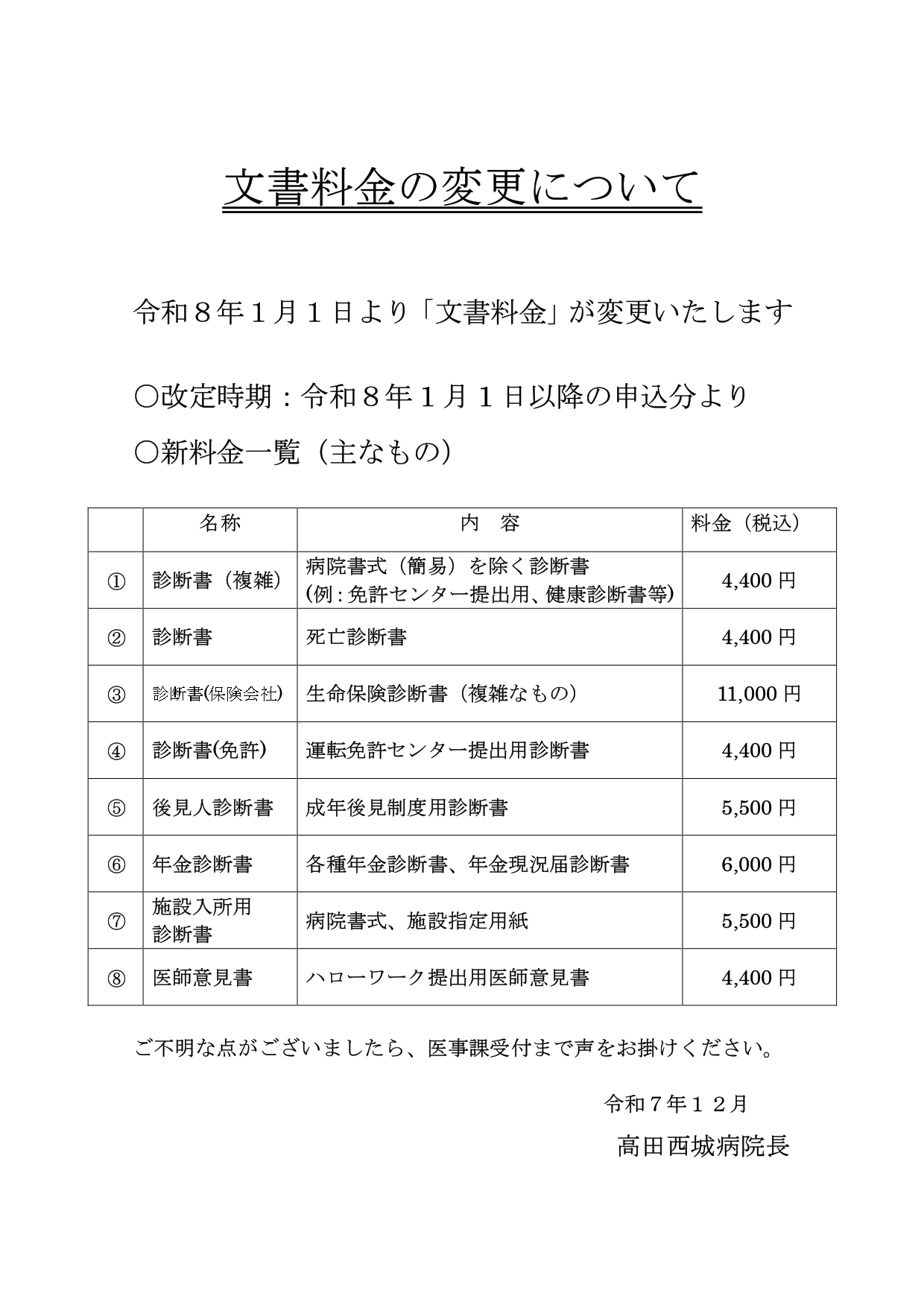 診断書などの文書料金を改定させていただくこととなりました。