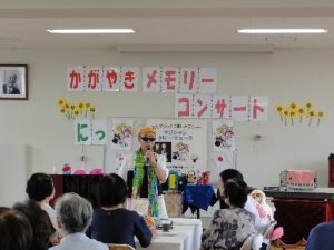 7月28日(土)10時より、当院にて「第35回 かがやきメモリーコンサート&にっこりカフェ」を開催しました。今回のゲストは、「タミー・チュータ」さん。歌にマジックに体操に、盛りだくさんな楽しい時間でした。後半は、にっこりタイム。「夏の思い出」をお題に、テーブルごとに交流を楽しみました。