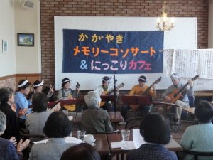 2019年度より会場を変更し、上越市市民プラザ「カフェ&ダイニング リラックス」さんにて、4月20日(土)10時から「第44回 かがやきメモリーコンサート&にっこりカフェ」を開催しました。ゲストはギターアンサンブルの「アモール」さん。お招きは初めてでしたが、皆さんが知っている曲ばかり!気持ちよくみんなで歌いました。